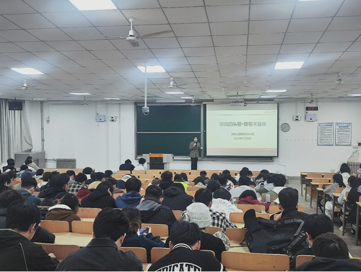 为进一步强化优良学风建设,持续营造勤学笃行、求真务实的学习氛围,2025年11月10日,光电工程学院2023级在教1-105教室召开“学风回头看,青春不重来”学风建设专题大会。辅导员陈慧英主持,2023级全体学生参会。