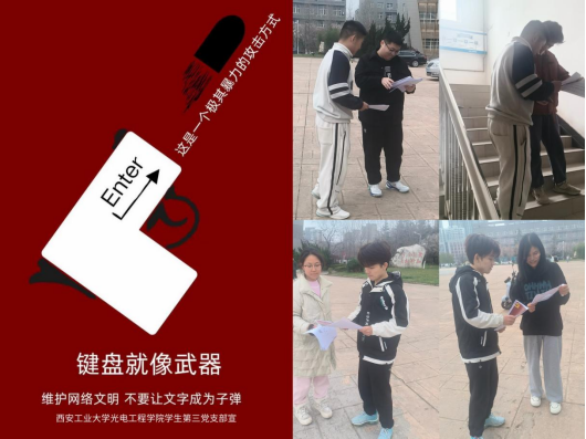 为深入推进网络文明建设,引导学生争做校园好网民,培育风清气正的校园网络生态,3月10至18日,光电工程学院学生第三党支部组织开展网络文明志愿行动,以多样形式推动网络文明理念见行见效。