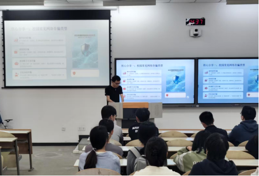活动伊始,李晨夕同学结合高校高发的网络诈骗案例,提醒大家切勿因一时贪念陷入圈套。随后,侯李娜同学讲解了个人信息泄露的潜在风险案例,呼吁同学们规范网络言行,拒绝传播谣言。随后,在互动问答环节,李凌枫同学现场模拟“中奖需先交保证金”的诈骗场景,引导同学们思考识破骗局的方法;李佳正同学则结合真实案例,分析了“陌生链接扫码”的隐蔽性风险,提醒同学们“未知链接不点击”是防范关键。活动最后,团支部发出“三不一多”倡议,号召同学们将反诈意识融入日常。