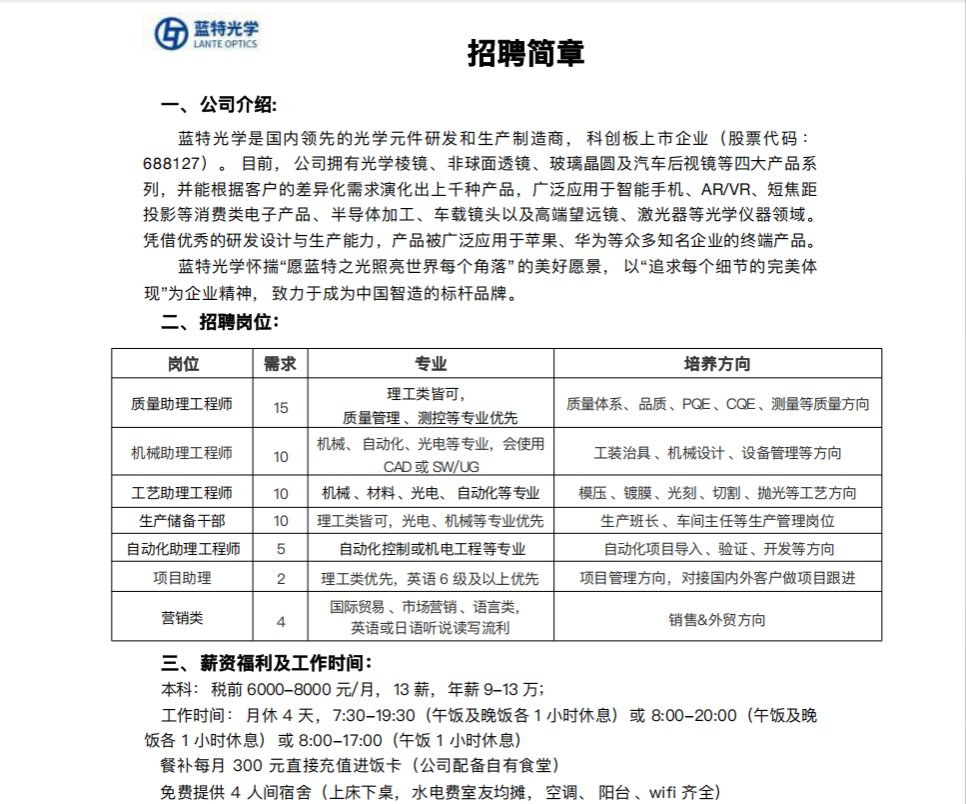 蓝特光学招聘简章