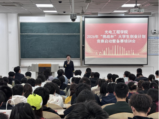 为激发学生科技创新意识,增强创新能力,全面提升学生综合素质,10月10日光电工程学院在教1-104举办“光电点亮未来,挑战成就梦想”---光电工程学院2026年“挑战杯”大学生创业计划竞赛启动仪式暨备赛培训会。本次会议由院团委副书记陈慧英主持,250余名学生参加了本次活动。